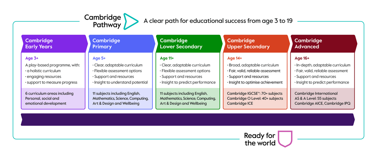 The Cambridge Pathway helps learners be ready for the world, offering five stages of education from age 3 to 19, leading seamlessly from early years to pre-university. Each stage builds on the previous and further shapes learners’ knowledge, understanding and skills.